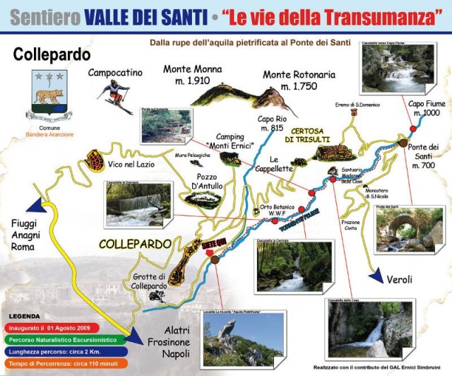 Partenza con macchina propria intorno alle ore 8:30 da Piazzale Bachelet (Padre Pio) per ritrovarsi a Collepardo (Giardinetti) intorno alle ore 10:00. Prima del bivio per le grotte di Collepardo troveremo uno spiazzo sulla sinistra dove parcheggiare. Di lì, dopo cinque minuti, imbocchiamo il tratturo. Siamo a quota m. 562 per arrivare fino a Ponte dei Santi con un percorso che costeggia interamente il torrente Fiume, tra passaggi incantevoli, cascatelle naturali e ponti di legno. Dopo Km 3,700 per un cammino di due ore si raggiunge quota m. 682, dove troviamo la meta: il Ponte dei Santi e il Ristorante Capo Fiume.
